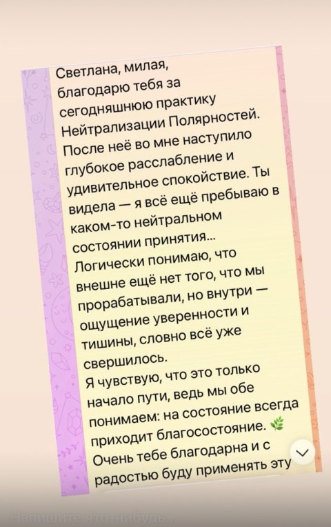 Техника нейтрализации полярностей особенно хорошо помогает в работе с проблемами в отношениях. Клиент прорабатывает свои сильные негативные чувства, будь-то раздражение, злость. вина. обида и пр. После проработки, он уже не может также реагировать на партнера, как раньше. У Алены, как раз и был запрос про коммуникацию в отношениях, и одна сессия привела к изменениям, о которых она рассказала в отзыве.