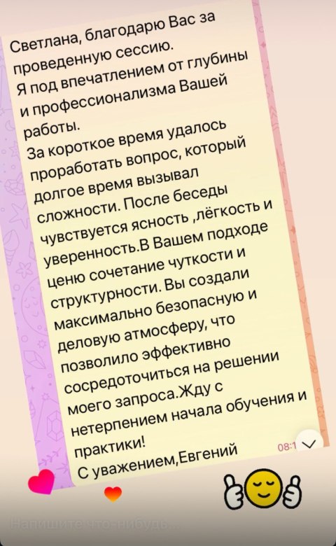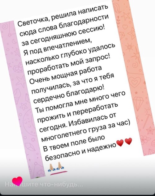 Работали с запросом про отношения, проработали более десяти пар полярностей. Подсознание девушки выдало очень много подавленных негативных эмоций. которые мы успешно проработали. Отношения с человеком, с которым работали, начали улучшаться буквально с первой же недели, а через 1,5 месяца на момент записи отзыва, они были стабильными и не приносили клиентке никакого беспокойства и страданий,