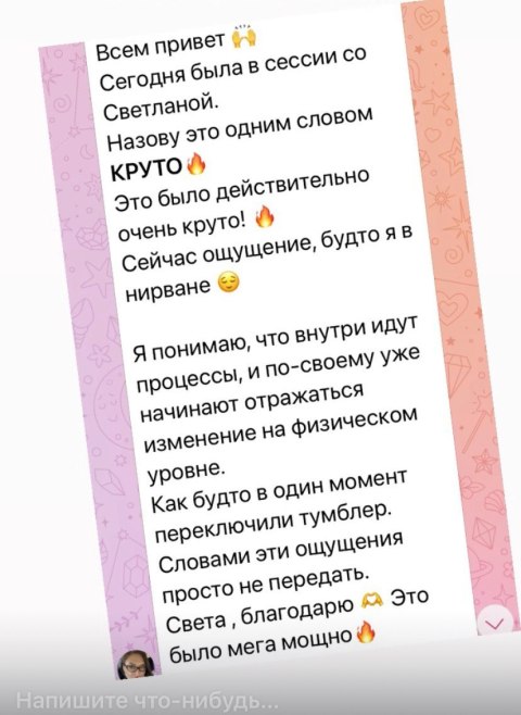 Работали с запросом про отношения, проработали более десяти пар полярностей. Подсознание девушки выдало очень много подавленных негативных эмоций. которые мы успешно проработали. Отношения с человеком, с которым работали, начали улучшаться буквально с первой же недели, а через 1,5 месяца на момент записи отзыва, они были стабильными и не приносили клиентке никакого беспокойства и страданий,