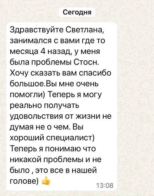 За 1 сессию проработали страх воды, с которым девушка жила почти 30 лет. Через три дня она уже начала плавать в бассейне.